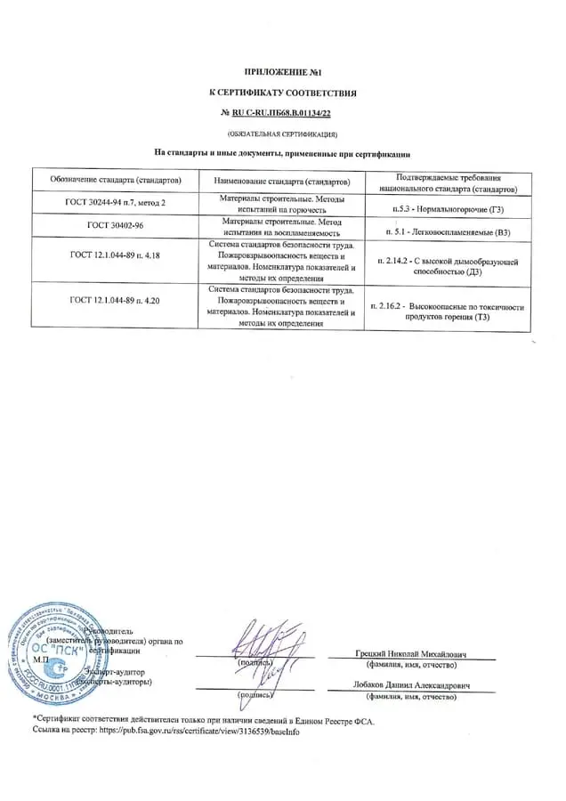 Пожарный сертификат на напылительные системы (класс горючести Г2)