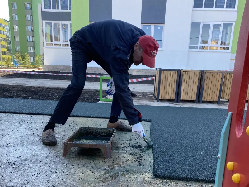 Смесь наносить на праймер, пока он липкий. При нанесении резиновая крошка прилипает к поверхности.